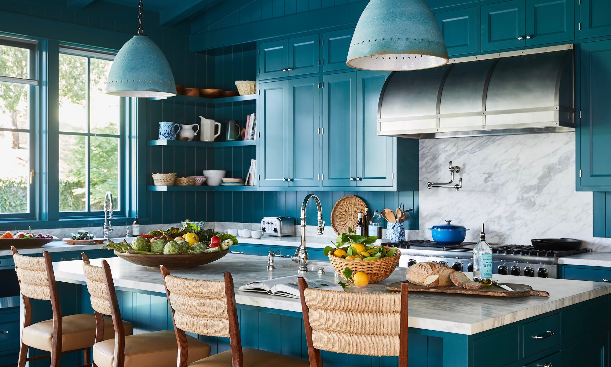 For Dunham, this meant swathing the kitchen and adjoining dining room in a bright shade of peacock paint that draws from the hues of the great outdoors. “It’s crucial to choose a color that’s both impactful and easy to live with,” he says. “Blues and greens are a more natural choice if there’s greenery surrounding—color is a way to connect with the outside.”