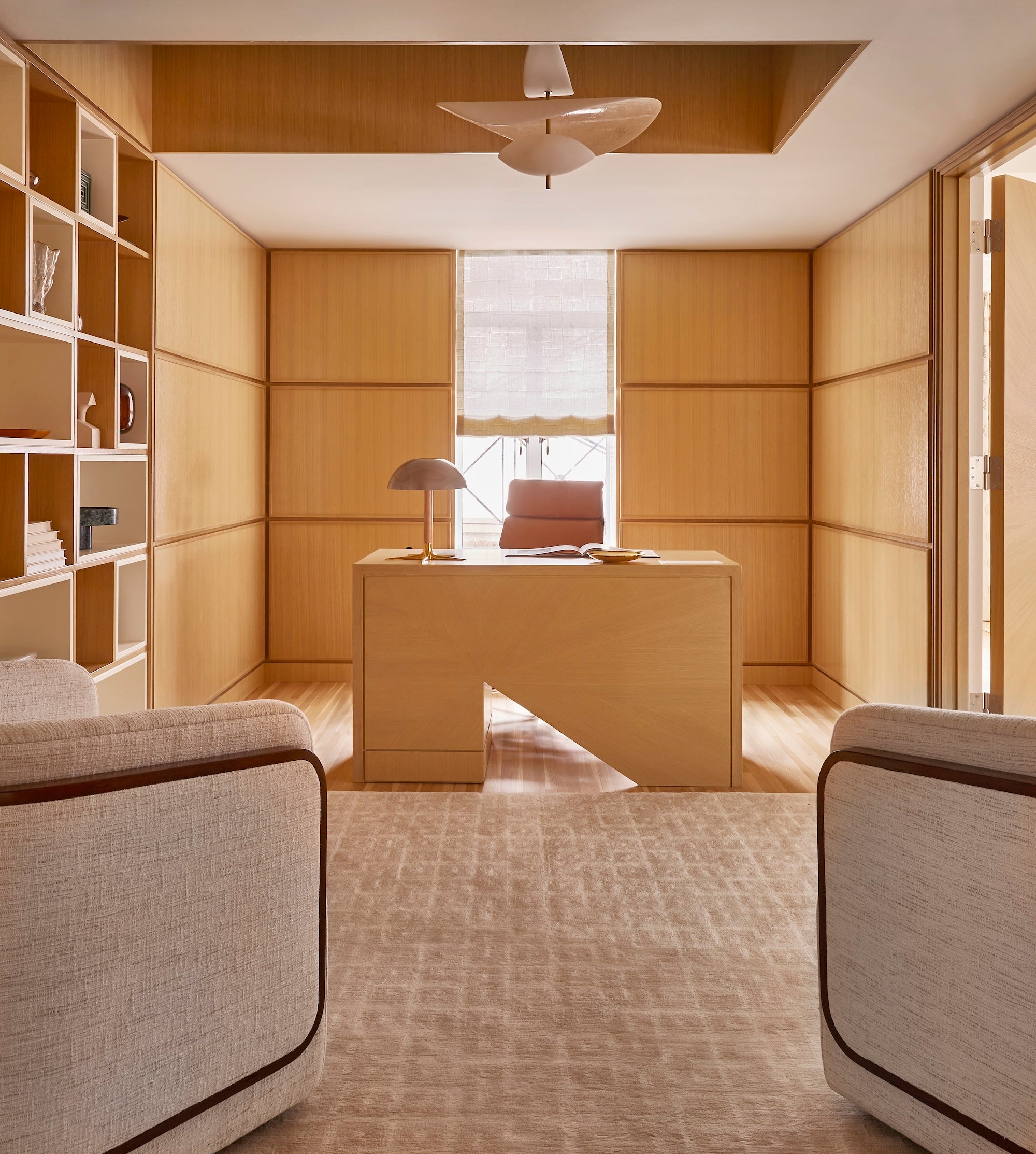 When Young Huh’s clients walked her through their new Park Avenue penthouse, the New York designer immediately saw potential. The space, purchased from a well-known collector, had low ceilings and a sparse, gallery-like aesthetic, but was ready for reinvention with a bit of architectural interest. Yet the project’s transformation from a stark white box to a luminous retreat in shades of cream and gold hit a few bumps in the road—most notably when the team opened up the unit’s ceiling to discover a network of crisscrossed pipes and ducts that could not be moved, and which precluded the firm’s plans for an elegant coffered ceiling.