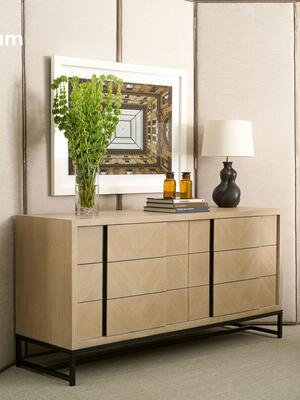 Vistage custom sofa with Textures two-door credenza with cane doors
