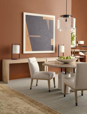 Tessa M2M dining table with burl insert, Evelyn waterfall dining chair, Chippendale side chair