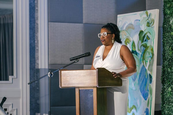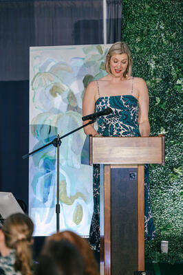 Committee chair Sarah Storms addresses guests